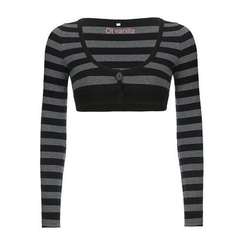 بلوز کراپ / کراپ استین بلند دکمه دار طرح راه راهناموجود