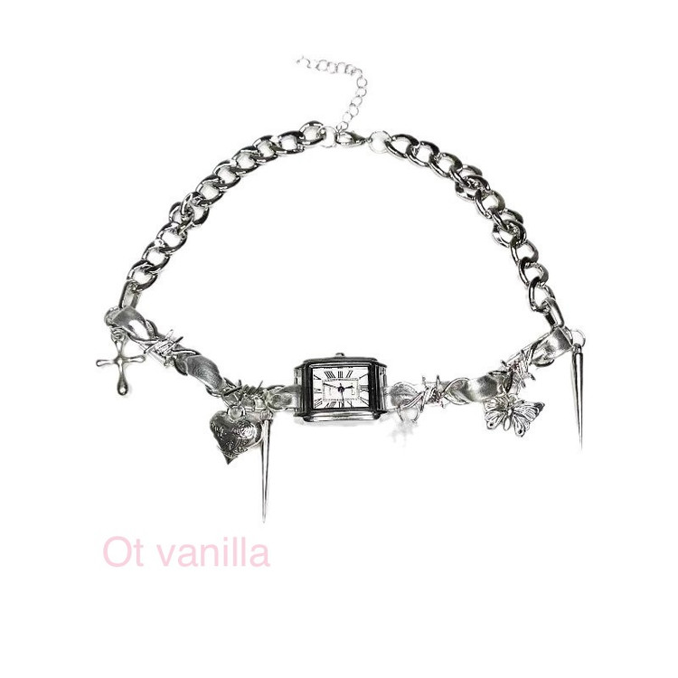 چوکر ساعتدار نقرهای یک اکسسوری خلاقانه و چندمنظوره است که ترکیبی از زیبایی گوتیک و عملکرد عملی رو ارائه میده. این گردنبند با زنجیرهای ضخیم و براق نقرهای ساخته شده و با آویزهای متنوعی مثل قلب خاردار، پروانه ظریف، صلیب کوچک، سیم خاردار پیچخورده و spikeهای تیز زینت داده شده. مرکز آن یک ساعت کوچک مربعی با صفحه سفید و عقربههای کلاسیک قرار داره که زمان رو دقیق نشون میده و با باتری کار میکنه (قابل تعویض).