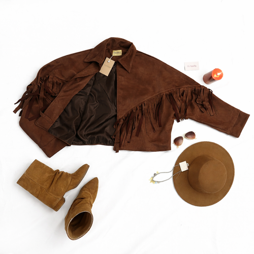 جکت قهوه ای کاوگرل فرینج | ژاکت قهوه ای جیر وسترن زنانه